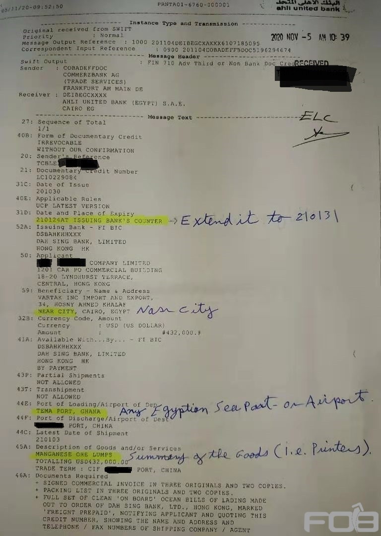 這個圖很明顯看到印章,11.6日阿赫利就收到LC了,但是阿赫利拒絕承認收到LC(這最后成為了我控告埃及阿赫利的有力證據(jù)),圖中要求把發(fā)貨港從加納改成美國港口,錳礦改成廚房用具,也怪我們粗心,后面的事情,你們也就知道了。